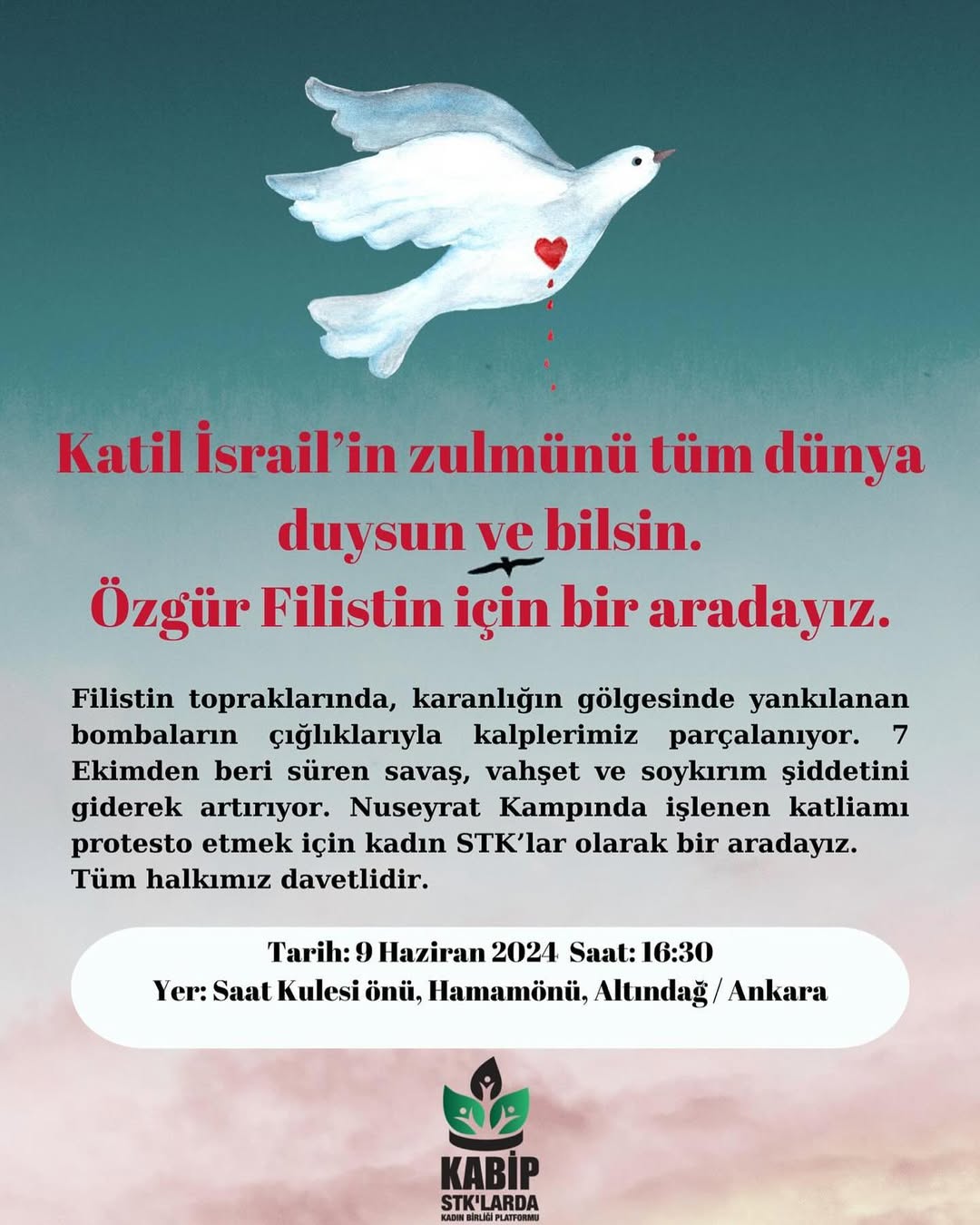 Ankara'dan başlayarak tüm dünyaya haykırıyoruz: Filistin'in yanında durun, Gazze'ye umut olun! İsrail terör devletinin vahşetini ve zulmünü görmezden gelmeyin. Birlikte insanlık onuruna yakışır bir dünya için mücadele edelim. Gözyaşları yerine umut, keder yerine sevgi dolsun dünyaya...